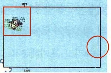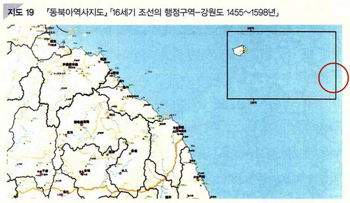 이 지도에서 울릉도 쪽 검은 상자를 확인해보면 울릉도의 영역을 독도까지로 설정해 놓고 있다. 저 검은 상자 오른쪽에 분명 하얀 점이 있는데 그게 독도다. 울릉도를 표시한 상자인데 울릉도가 맨 왼쪽에 있다. 그럼 오른쪽엔 뭐가 있길래 저렇게 상자 표시를 한 걸까?