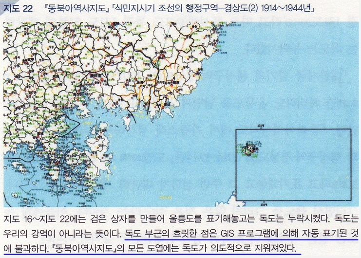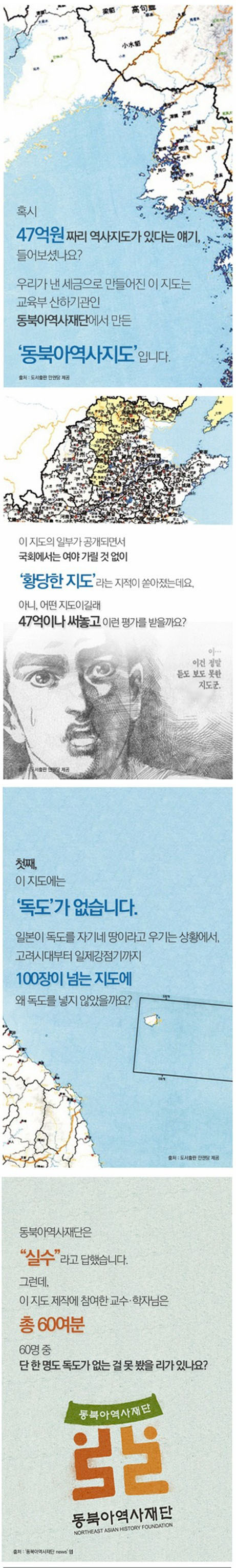 게다가 독도를 제외시켜서 일본 극우파의 침략사관에 동조하기까지 했다. 이것이 대한민국 국민 세금 47억여 원을 들여서 만든 『동북아역사지도』의 현주소다.……고구려와 한나라 국경선이 세로로 무 자르듯 뚝 잘려 있다. ‘실수’로 독도가 증발했다. 4세기를 나타낸 지도에 신라와 백제가 쏙 빠져 있다.