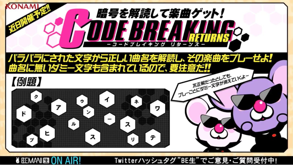 [1] 楽器(ガッキ), 미라이다갓키의 갓키도 이것이다.[2] 리뉴얼 악곡은 PHASE 상관없이 통상해금[3] 2015/11/12부터 진도 촉진 소재 추가[4] 2015/11/19부터 진도 촉진 소재 추가[5] 2015/11/26부터 진도 촉진 소재 추가[6] 2015/12/3부터 진도 촉진 소재 추가[7] 클래스체크에서 풀콤보 (핑크색 키) → 노말모드에서 플레이(흰색 키) 식으로 얻을 수는 있다. 일단 키를 받으면 둘 사이의 구분은 사라진다.[8] V2의 스페셜 보면은 V2를 보면에 상관없이 매칭하여 승리하면 해금된다.[9] 리더인 DJ TOTTO를 제외한 6명. 이미 악기 연구소 해금곡으로 곡을 제공했기 때문에 이쪽에는 참전하지 않은 것으로 추정된다.[10] beatnation RHYZE vs HARDCORE TANO*C 참가자 중 DJ NAGAI와 Noizenecio가 빠지고 Kobaryo가 추가되었다. 마찬가지로 리더인 DJ NAGAI는 악기 연구소 해금곡으로 곡을 제공했기 때문에 참전하지 않은 것으로 추정.[11] 프리미엄 플레이 시 EXTRA ROUND[12] 라는데 1년이 다 되어 가는 지금까지 아무런 언급이 없다. 다만 1년이 거의 다 지난 후에야 벌칙 게임 곡이 나온 것을 보아 리플레시아에서 2회 이벤트가 열릴 것으로 추정된다.매 작품마다 우려먹기[13] 종료 직전에 SAFETY ZONE 라인의 절반 이상을 넘어왔지만 끝내 탈락하였다.(...)[14] 원문은 더미 문자(ダミー文字)[15] 이 함정문자는 1회 플레이시 하나씩 제거된다.[16] 狂喜宴舞, 狂鬼村正[17] 激アツ☆マジヤバ☆チアガール[18] 4-5-10 → しごと(일)의 고로아와세. ギミチョコ!! SP 난이도 또는 混ぜるな危険 SP 난이도가 해당된다.[19] BEMANI MUSIC FOCUS에서는 가장 최신곡이 2008년(...)에 나왔다. 다만 어퍼 내 전체 이식곡으로 본다면 골든 위크나 아사키의 세계 등에서 비교적 최근에 나온 곡도 이식했다.[20] Benita, ヴェニスの慕情 2곡이 해당된다.[21] ホーンテッド★メイドランチ, 滅びに至るエランプシス, ホメ猫☆センセーション, ぽかぽかレトロード 4곡이 해당된다.[예시] No.1의 'は'의 경우 ハッピーライムライト,バサラ, パピプイェー 등은 인정, 같은 は행인 ファイヤーファイヤー, ポチコノシアワセナニチジョウ 등은 불가. 참고로 V 발음의 경우 시스템 상에서는 ば행으로 인식하므로 ヴァリスネリア (→バリスネリア)도 가능.