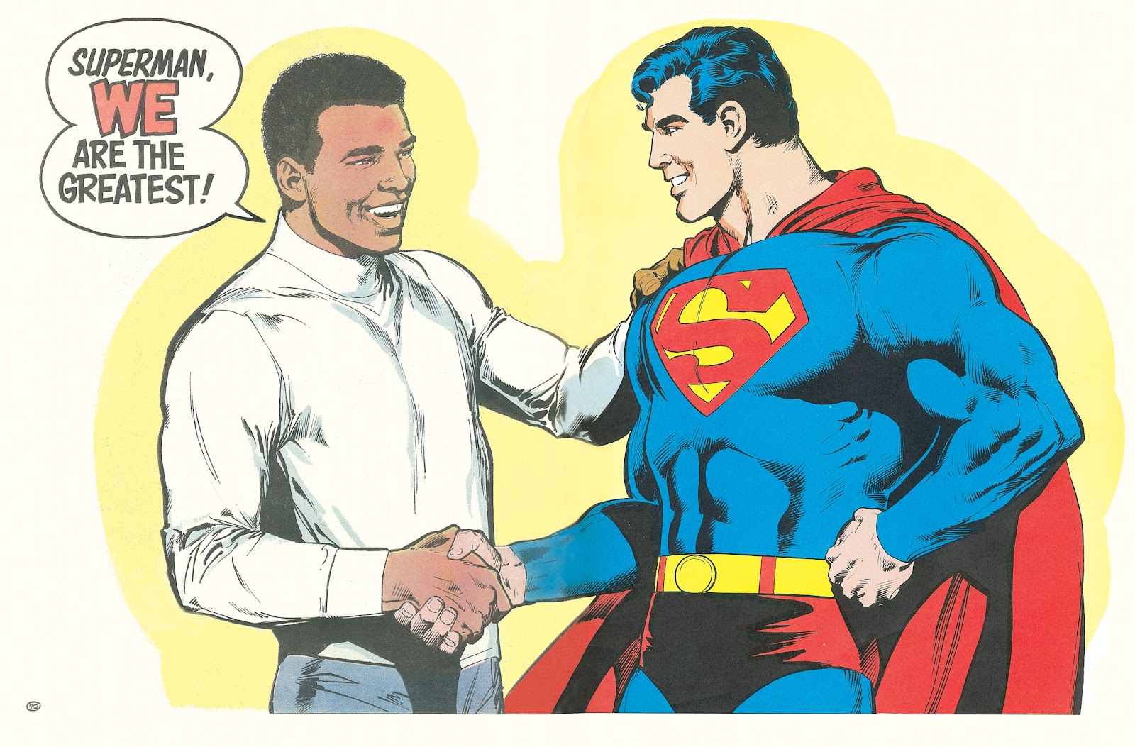 - 슈퍼맨과 싸운 만화책이 있다. 한 외계인이 자기네 최강의 전사와 싸울 지구 최강의 전사로 슈퍼맨을 선택하자, 알리가 '슈퍼맨은 지구인이 아니고 슈퍼파워를 가졌으니 불공평하다'라며 누가 지구 최강의 전사일지 판가름낸다는 내용. 말도 안 되는 대결 같지만 붉은 태양( 슈퍼맨의 힘을 일시적으로 빼앗는다.) 근처의 행성에서 경기를 치렀기에 슈퍼맨은 일반인인 상태였다. 그리고 대전끝에 알리가 슈퍼맨을 쓰러트린다! 들것에 실려나가는 슈퍼맨 이후 외계인 챔피언과 대전에서 알리가 승리를 거두고, 서로 악수를 나누며 훈훈하게 마무리.