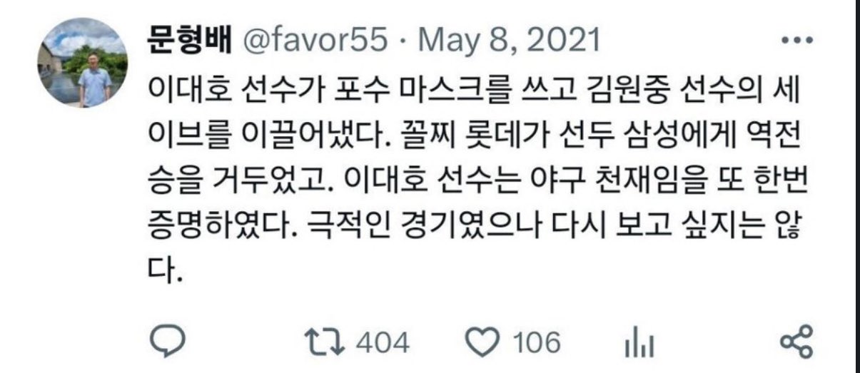 - 2021년 5월 8일, 삼성 라이온즈와의 경기에서 포수 엔트리를 다 쓴 롯데가 이대호를 포수로 출전시킨 끝에 승리한 경기에 대해 "극적인 경기였으나 다시 보고 싶지는 않다"는 야구 팬다운 평을 남겼다.#