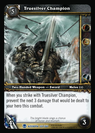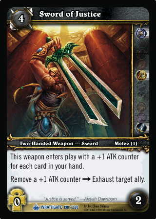 월드 오브 워크래프트에서 등장한 양손 도검 정의의 칼날이 원 모델인데, 직업 공용 파템에 특수 효과도 없는 무명 템인데도, 특이한 룩 때문인지 채택되었다. 와우TCG의 카드.
