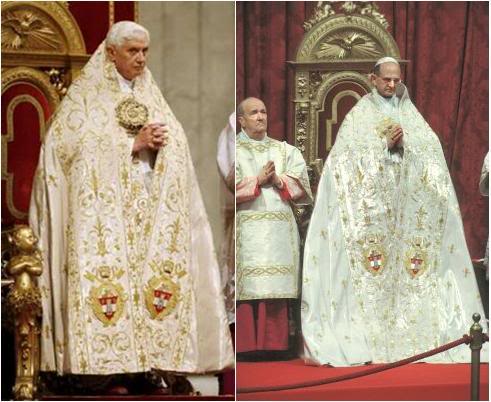 만툼을 입은 요한 23세 | 다소 개량한 만툼을 입은 베네딕토 16세 |