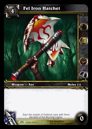 | 플레이버 텍스트 | 그롬마쉬 헬스크림이 다루던 유서 깊은 도끼입니다. 어떻게 공작 말체자르의 손에 들어갔는지는 아직도 알 수 없네요. (Grommash Hellscream's famous axe. Somehow this ended up in Prince Malchezaar's possession. Quite the mystery!) | ||||