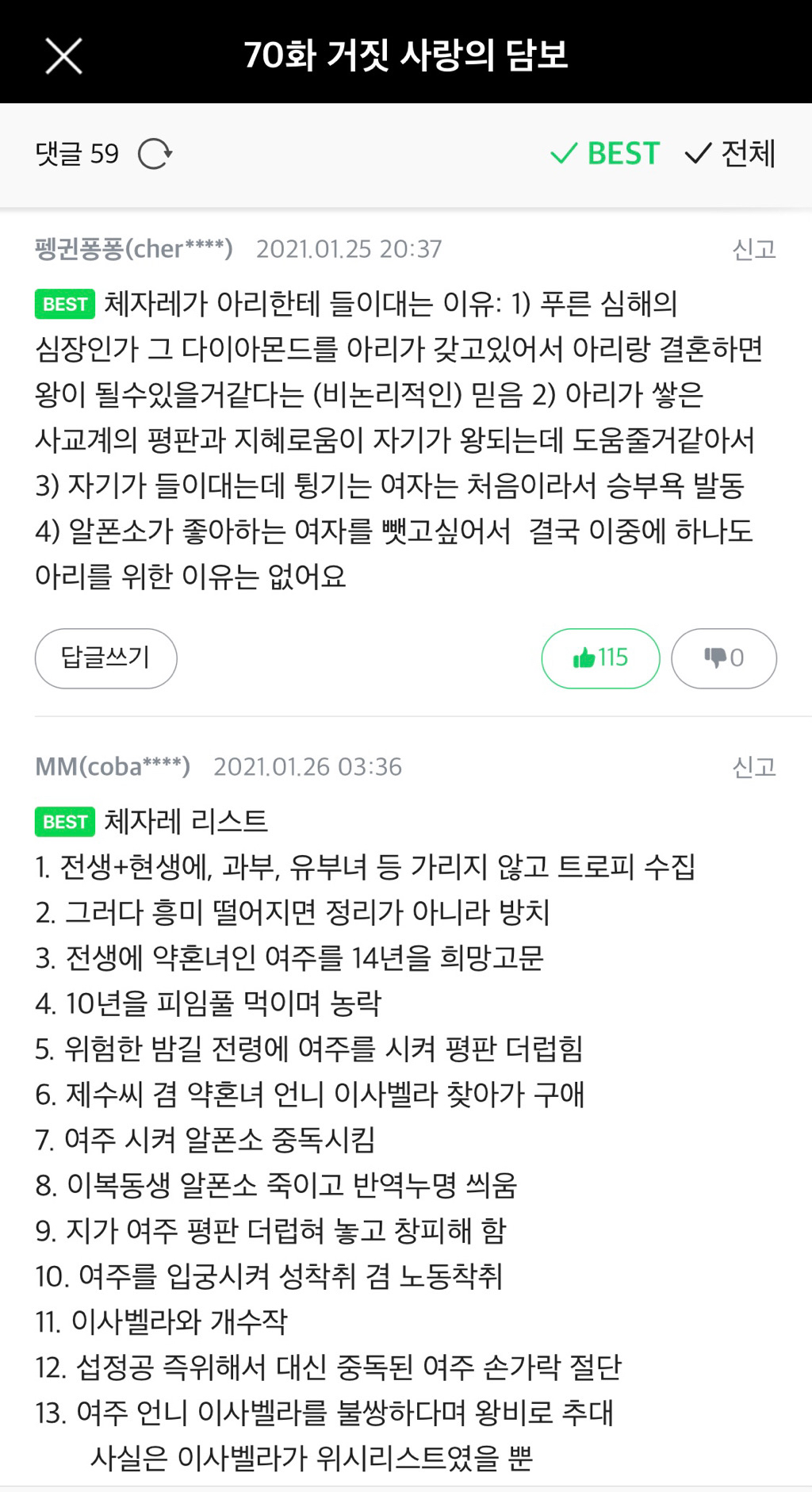 [1] 아리아드네가 회귀한 직후.[2] 아리아드네와 약혼했으나 이사벨라와의 추문으로 파혼당한 시점.[3] 알폰소의 왕국 귀환 시점.[4] 사실은 아버지[5] 사실은 적모이다. 적모는 아버지의 정실부인이라는 뜻이다.[6] 사실은 이복 남동생[7] 회귀 전과 후 모두 포함이다. 다만 회귀 전에는 체자레 쪽에서, 회귀 후에는 아리 쪽에서 파혼을 요구했다는 것이 차이점이다.[8] 파나메레 자작이 필사적으로 약혼 서류에 사인하는 걸 막고 있기에 정식 약혼은 아니다.[9] 급조된 왕족이라 약간의 논란이 있다. 율리아 헬레나보다 과연 높은 신분인지 설왕설래가 오간다고.[10] 체자레는 공식적인 호적으로는 선대 데 코모 백작(비아조 데 코모)의 아들로, 알폰소의 사촌 포지션이다. 하지만 그가 레오 3세의 사생아라는 사실은 중앙 궁정 귀족들 사이에서 알음알음 알려져 있다. 또한 선대 데 코모 백작은 실제인물이 아니라 서류상에만 존재하는 허무인이라는 사실은 산 카를로의 사교계 상류층이라면 모두가 눈치채고 있다. 그래서 데 코모 백작이라는 호칭을 피하고 체자레 백작이라고 보통 부른다.[11] 레오 3세가 데 마레 추기경을 회유해 출생기록부에 손을 대서 체자레를 존재하지도 않는 죽은 남동생의 아들로 둔갑시켜서('비아조 데 코모 백작'으로 알려져 있던 남동생을 '비아조 데 카를로'로 정정), 데 카를로 왕가의 일원으로 인정하면서 에트루스칸 최북단 변경에 있는 유서 깊은 피사노 가문의 영지와 공작위를 체자레에게 내렸다.[12] 율리아 헬레나 공녀와의 프린치페사 계약을 이행할 필요성에 따라 대공으로 작위가 올랐다.[13] 검은색에 가까운 짙은 색이라고 한다. 모친인 루비나 백작 부인에게서 물려받았다. 웹툰판에서는 좀 더 붉어보이게 그려졌다.[14] 레오 3세가 물려준 카를로 왕가의 눈이다.[15] 웹툰 PV. 알폰소와 중복이다.[16] 이사벨라와 결혼하고 왕으로 즉위할 때.[17] 당시 알폰소의 미망인이었으므로 공식적으로는 데 카를로다.[18] 비앙카가 본인의 육촌 여동생이고 제수씨에서 아내로 맞은 이사벨라가 이폴리토의 여동생이기에 처남임과 동시에 매제가 된다.[19] 그러나 국왕으로 즉위한 지 얼마 되지 않아 왕국이 멸망하였기에 즉위 기간은 1년도 채 되지 않는다.[20] 알폰소, 이사벨라보다 4살 많다.[21] 이 점 때문에 이사벨라가 자신의 능력에 맞지 않게 자신을 돋보이게 하려다가 꼴이 우스꽝스럽게 되어 버렸을 때에는 감싸주기는커녕 오히려 조소하기도 한다.[22] 어머니를 닮은 거라고 한다. 참고로 아버지인 레오 3세는 뼈대가 굵은 편이다.[23] 류트 연주, 명화 감상, 라틴어 등의 공부를 하라고 요구했다.[24] 이 과정에서 아리아드네는 양치기 소년과 사랑에 빠진 흉내를 내야 됐고 그녀는 부정한 약혼녀라 불리며 평판이 바닥을 치게 된다.[25] 아리아드네는 자신이 혼전에 아이를 가지는 게 싫다면 결혼을 하고 취하라고 거부했지만 체자레는 자신을 사랑하면 증명해보라고 가스라이팅을 했다.[26] 아리아드네가 중독되어 쓰러졌을 때 체자레는 굳이 왼손 약지로 배독을 하라 명령하여 그 손가락이 남들보다 한마디가 짧았다.[27] 애초에 둘의 관계는 진작에 파탄났을 것인데 이사벨라는 아리아드네처럼 체자레에게 헌신할 사람도 아니고 아양이나 떠는 매우 속물적인 여자라 관계가 파탄났으면 났지 결코 좋을 수가 없었을 것이다. 체자레의 근시안적 성향은 이미 초반부터 나온 것이다.[28] 알폰소의 여자라서 빼앗고 싶다는 욕심도 생긴다.[29] 다만 아리아드네는 회귀 전 은방울꽃을 꺾어 주던 때를 떠올라 기분이 나빠지고, 결국 아리아드네는 드레스는 돌려 보내고, 장미 꽃다발은 시들어서 어쩔 수 없이 받는다.[30] 본의 아니게 이사벨라가 내연녀로 몰리게 된 건 덤이다.[31] 정확히 말해서 그가 분노한 이유는 어머니가 아들인 자신을 아무리 봐도 살 길이 없는 외통수로 몰아넣었다는 점에 있다. 만오천 명이나 되는 중무장한 기병을 상대로 훈련이 제대로 안 된 사병을 데리고 맞선다는 것 자체가 말이 안 되는 것이었으며, 설령 그 말이 안 되는 짓이 성공한다 하더라도 국왕의 경계를 살 것이 뻔하다. 이에 그는 줄곧 품고 있었던 의문, 과연 어머니가 자기를 사랑하기는 하는지에 대해 묻고 싶어하지만 사랑하지 않는다는 대답이 나올 일말의 가능성조차 견딜 수 없었기에 하지 못한다.[32] 이 와중에 국왕은 혼인을 약혼으로 바꿔 낭독하고 교지 자체를 태워 버리는 식으로 응대한다.[33] 앞서 말한 말과 함께 체자레가 아리아드네도 이사벨라도 여자들을 그저 트로피 수준으로밖에 보지 않는다는 것을 잘 보여준다.[34] 실제로 독자들도 이사벨라가 거짓말한 것이라고 예상했었다. 그러나 결국 체자레가 한 말이 맞는 것으로 드러났다.[35] 정작 본인의 잘못으로 아리에게 파혼당했다는 건 전혀 생각도 않는 것은 덤이다. 그것도 모자라서 루비나와 클레멘테의 대화를 통해 아리에게 파혼당한 후의 생활이 밝혀졌는데 가만히 은둔해도 모자란 판국에 흑발의 키 큰 여자들만을 골라 하룻밤을 보내고 버리는 미친 짓을 벌였다고 한다! 아리가 키가 크고 흑발이라는 걸 생각해보면 그야말로 소름돋는 부분.[36] 전생