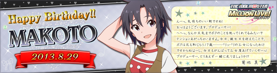 2011년 8월 29일 아이마스 애니메이션 홈페이지의 메인이 마코토의 메시지로 바뀌었다. 그리고 마코토는 이 메인 화면으로 제대로 사이클리스트 인증했다. 과거 생일축하 메시지에도 사이클링과 트라이애슬론을 언급한 적이 있었는데 이번 메인 일러스트로 쐐기를 박았다. 일러스트의 자전거는 비앙키의 로드바이크로 모델은 인피니토 11년식 울테그라 모델이다. 일단 천만원은 기본으로 넘어가는 녀석이다. 자전거의 묘사가 상당히 섬세하게 표현되어 있다. 참고로 2010년에는 자전거가 없으며 2012년엔 자전거와 함께 있지만 모델을 알 수 없다. 2013년 생일배너에는 자전거가 보이지 않는다.. 참고로 2013년 배너의 이미지는 아이돌 마스터 밀리언 라이브에서 마코토의 노멀 카드 일러스트이다. 다른 아이돌들(+사무원)의 배너도 모두 같다.