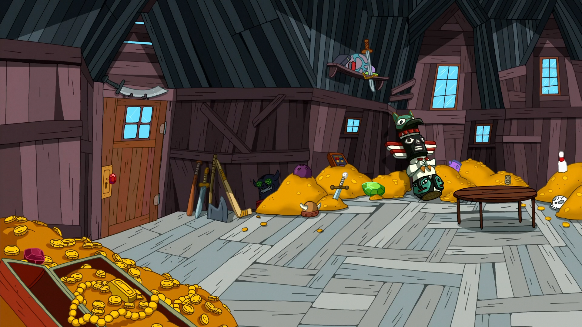 - 집에 모험으로 얻은 듯한 금은보화가 쌓여있다. 하지만 시즌 2 4화 Blood Under the Skin에서는 일본풍 갑옷을 구하는데 추즈 구스가 제이크의 머리(혹은 그정도의 가격)를 요구하자 너무 비싸다고 하는 장면이 있다. 시즌 4 16화의 Burning Low에서는 세금을 걷는다고 버블검 공주가 보물을 자루에 담는 장면도 있다. -