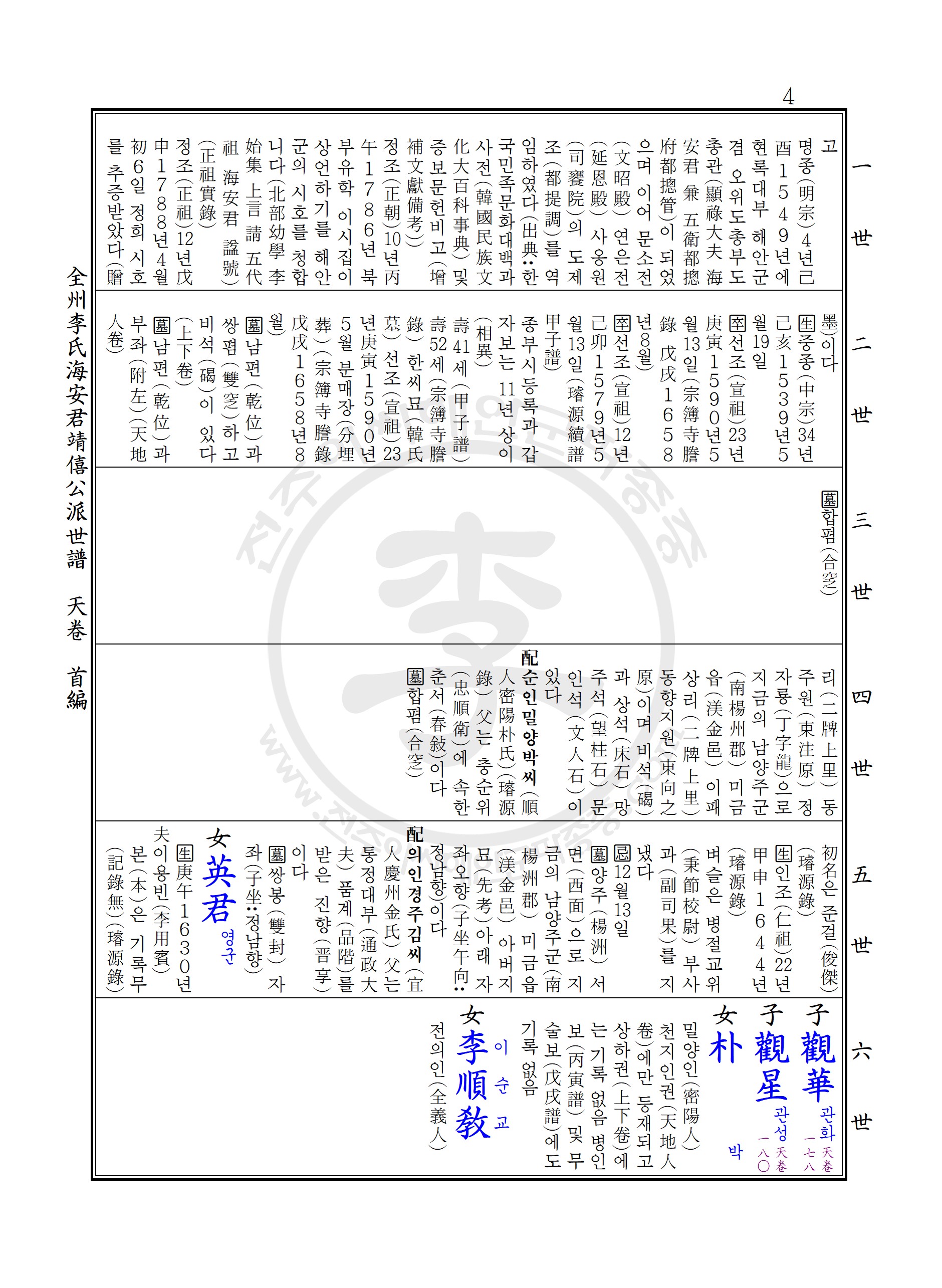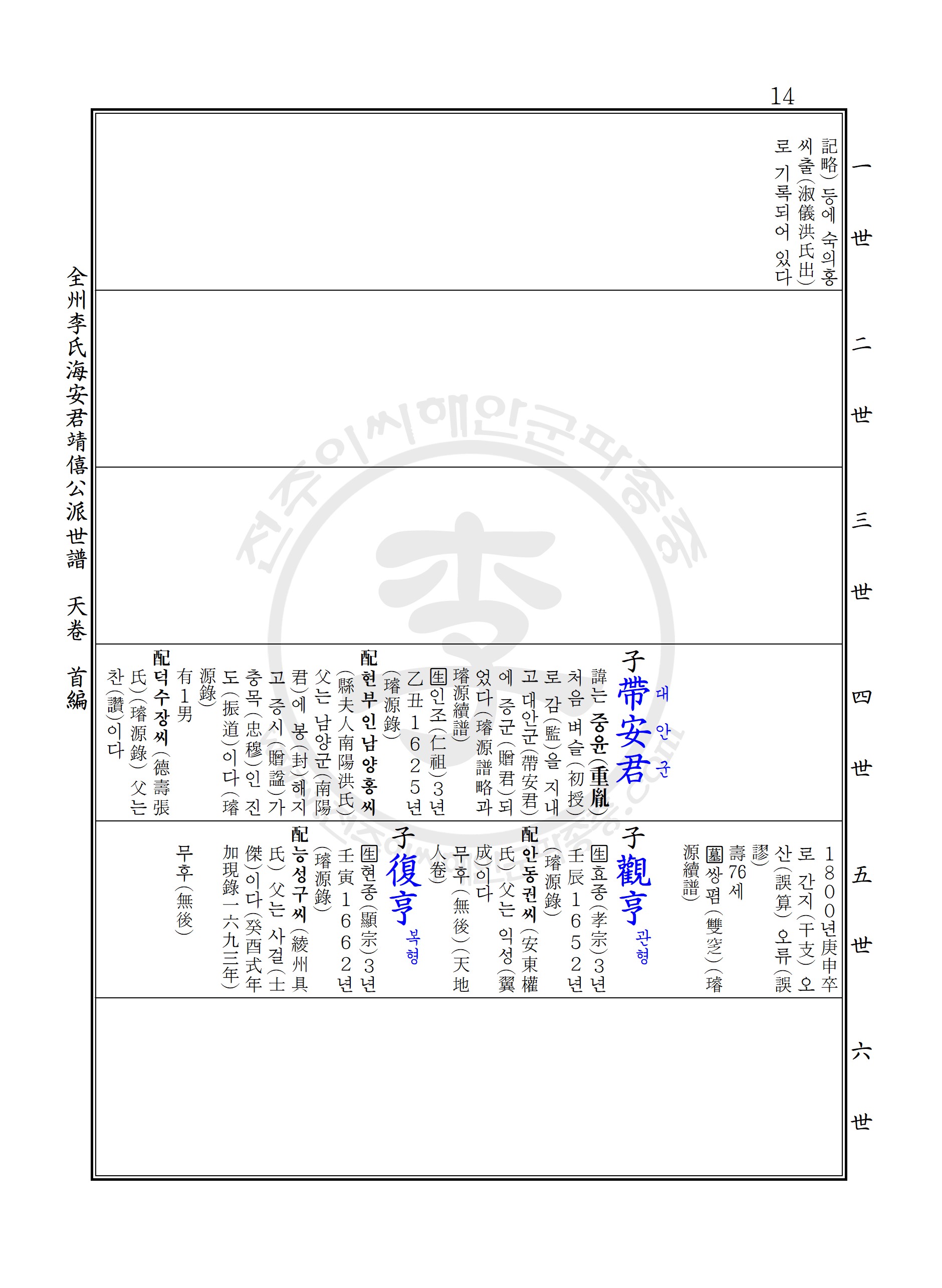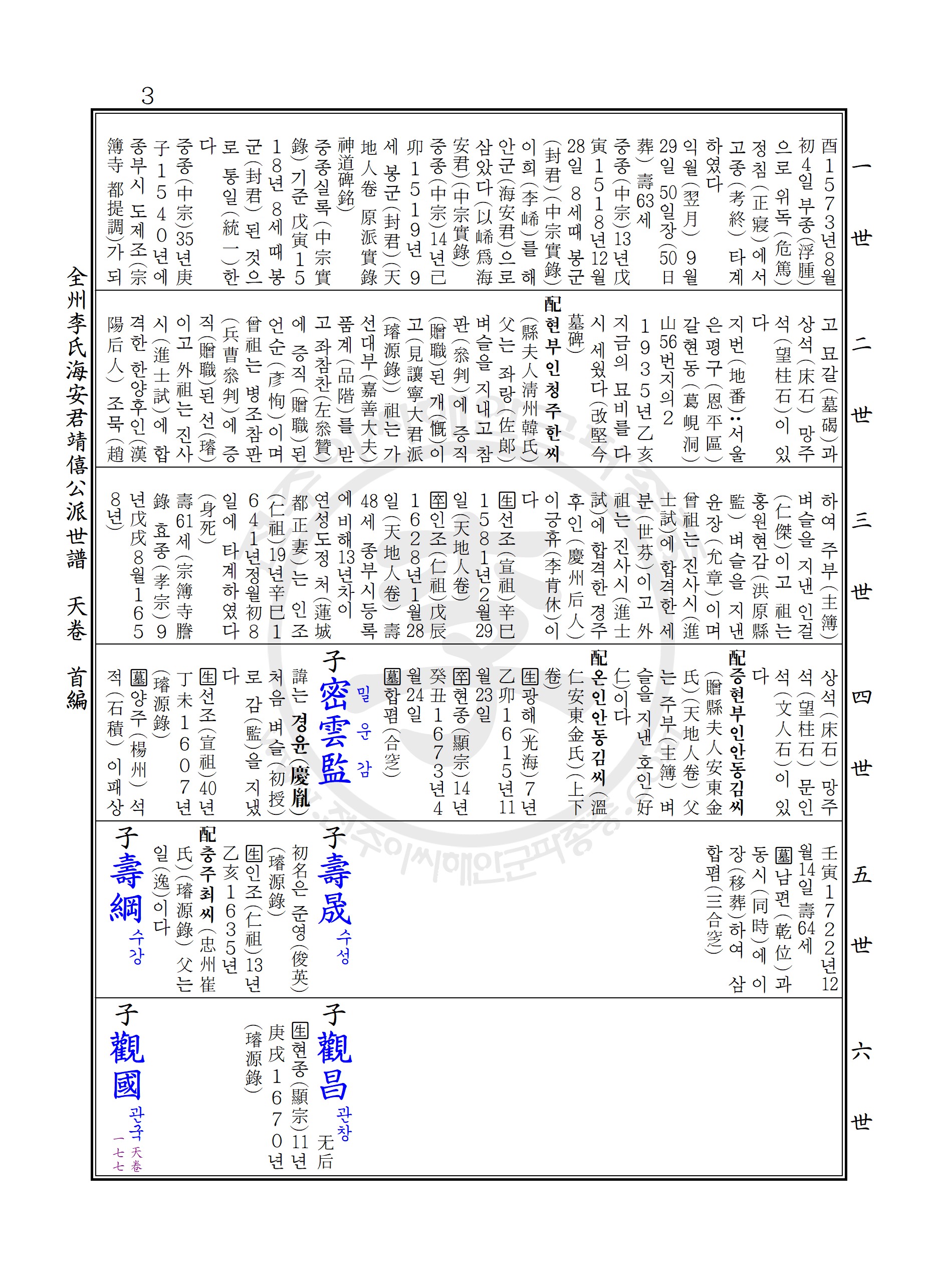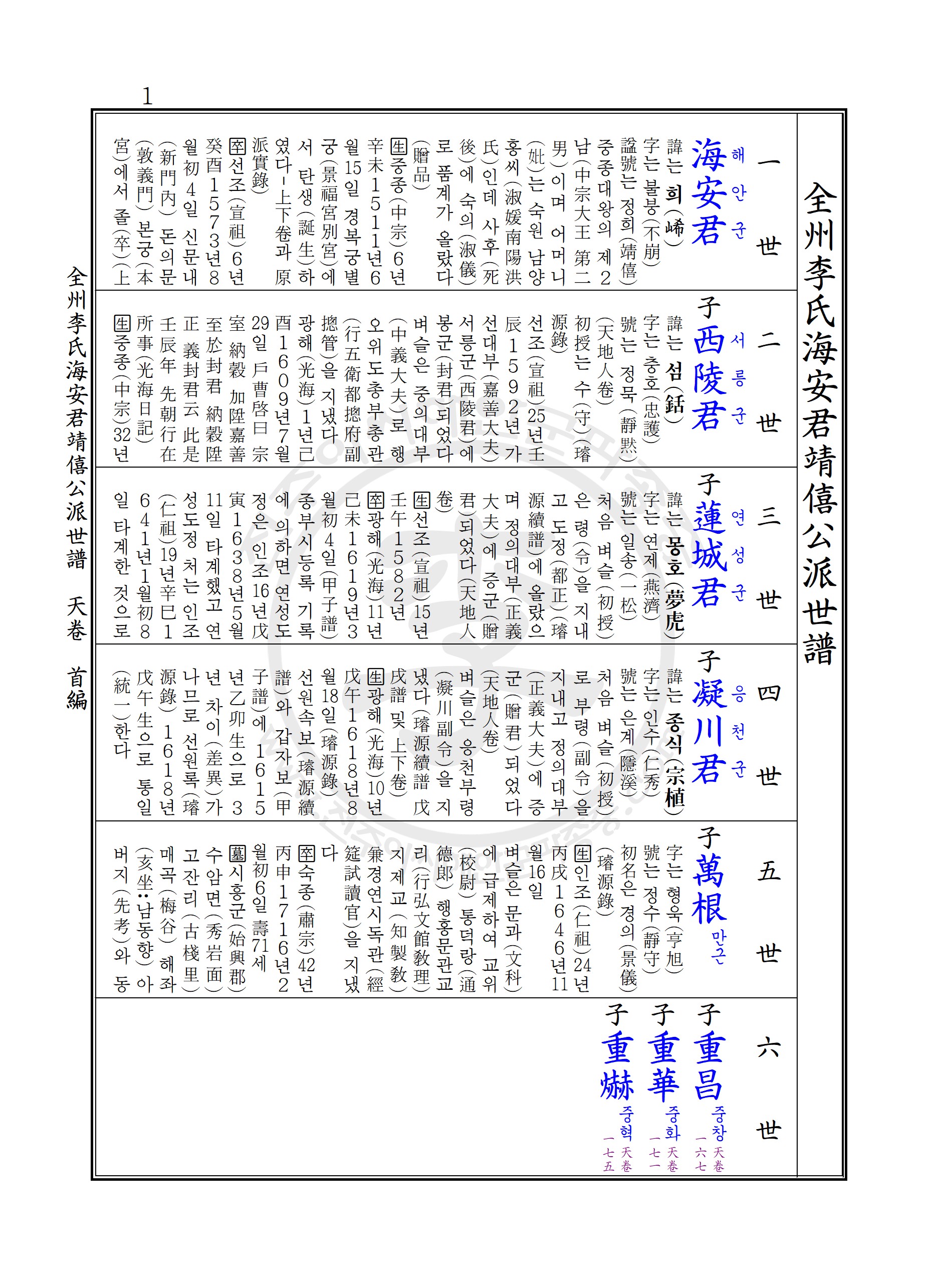 | 해안군파 역사 시작 | → | 1대 해안군 이희 | → | 2대 서릉군 이섬 | ||