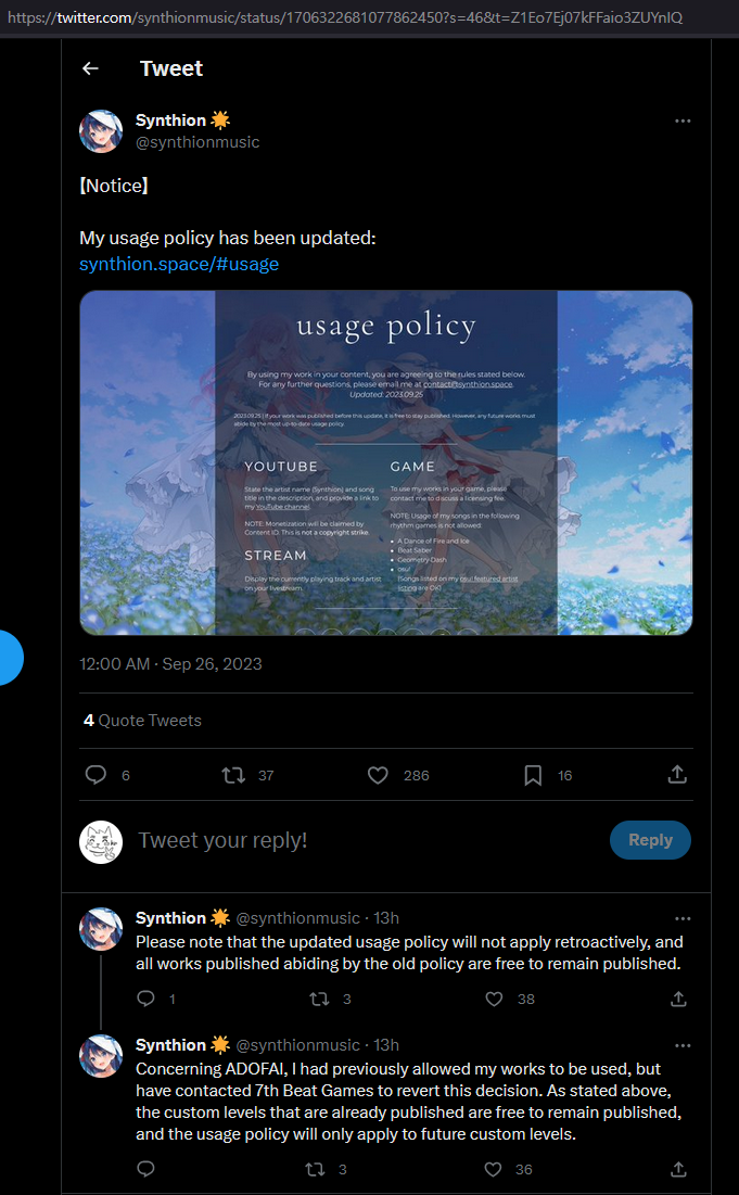 [2] S를 맞으려면 사실상 모든 공을 맞춰야 하는데 3성치고는 상당한 난이도를 보여준다.[3] 당연하지만 Synthion은 작곡만 했지 콘테스트에 관여한 것은 전혀 없다. 애초에 순위를 정하고 심사를 한 롭탑과 심사위원들을 욕하지도 않고 애꿏은 작곡가를 욕한 것이 문제다.[4] 현재는 그녀의 대부분 곡들이 인게임에서 Unknown으로 뜬다. 사실상 완전히 사라져버린 셈.[5] 영상을 보면 GD Colon이 Next Cab Soon과 아트 스타일이 비슷하다고 말하자 Arclia는 '이딴 쓰레기와 내 레벨을 비교하지 마라'라고 격하게 반응하는 것을 볼 수 있다. 참고로 Abducted는 실제로 Next Cab Soon에 영감을 받아 제작된 레벨이다.[6] 여담으로 트위터를 보지 말라는 조언을 들어서 이런 일이 있었다는 것도 몰랐다고 한다.[7] 설명란에 언급되어 있다.