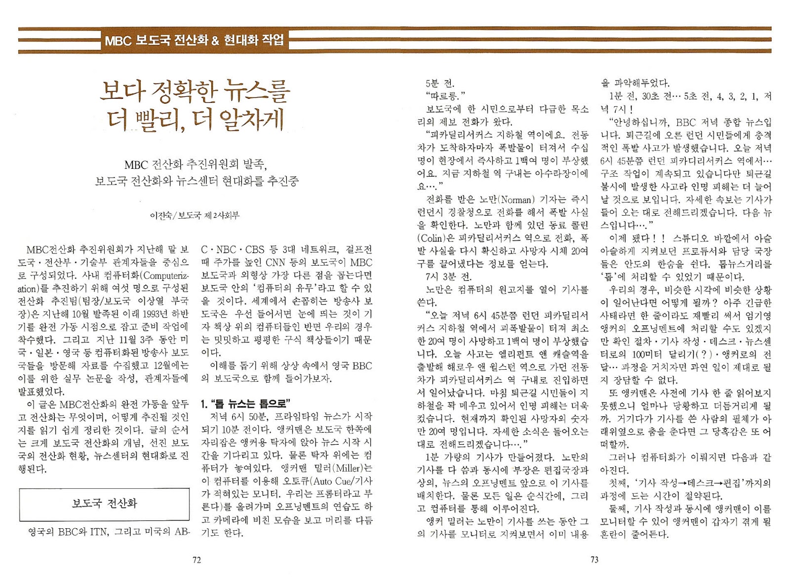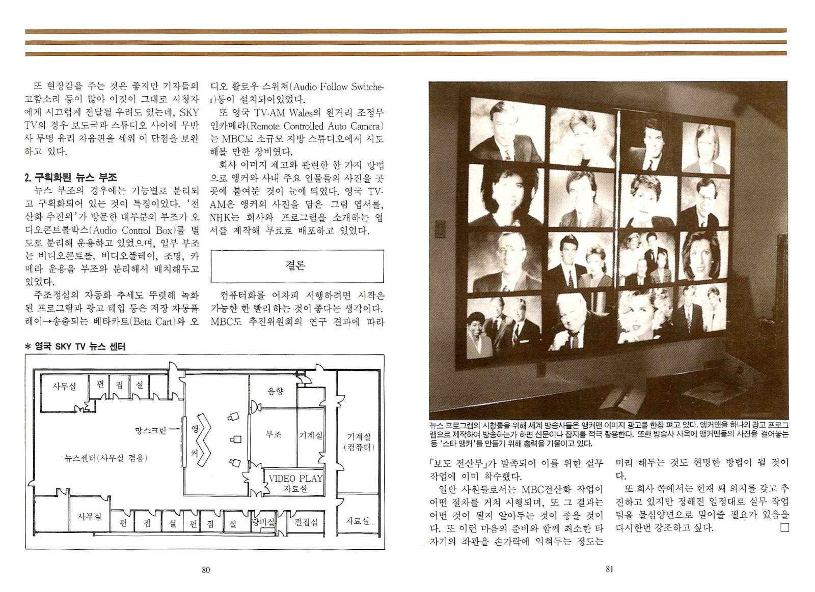 1984년 6월에 보도기획부를 해체한 후 '보도관리부'를 신설했고, 12월 영상편집부를 신설한 후 1987년 2월에 스포츠국을 보도국에 통합시키고 1988년 3월에 취재·편집담당 및 카메라담당 국장제를 도입했으나 이 또한 얼마 가지 못했다. 1989년 2월에 보도제작부 및 보도특집부가 보도국에서 분리되어 '보도제작국'으로 승격했고, 북한부도 부활시켰으며 4월 노사 공정방송위원회를 통해 국내 최초로 '뉴스의 속기록화'를 시도했다.[5] 1990년 3월에 스포츠국을 부활시키고 산하에 '스포츠카메라부'를 따로 뒀고, 보도제작국 산하에 특집카메라부를 신설한 후 <뉴스데스크> '카메라출동' 부활에 앞서 '기동취재반'을 신설했다. 1991년 10월 '보도전산화추진팀'을 신설하여[6] 1993년 11월 본격 개발에 착수, 1994년 1월 29일 LAN 기반 보도 전용 통신망을 구축하고 4월 4일 제1차 뉴스전산화시스템의 가동을 개시하여 6월 1일부터 본격 운용했다. 6월 27일 Tandem 기상 터미널, 기상방송 수신기, 자체개발 기상방송 운용시스템 'Orion'이 갖추어진 기상센터를 개설한 후, 국내 최초로 기상 디자이너 직제를 도입했다.[7]
