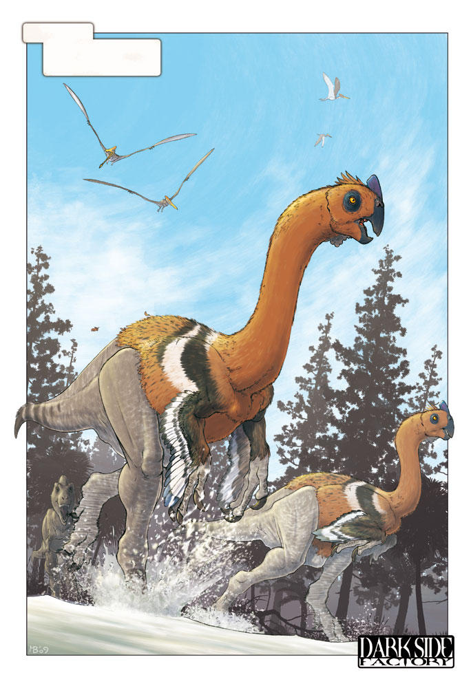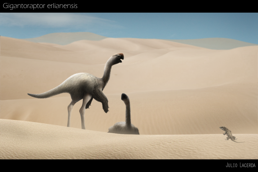 [1] 그도 그럴 것이, 이 대퇴골 화석이 발굴되게 된 계기가 소니도사우루스와 나름 연관이 있었기 때문이다. 2006년 소니도사우루스의 공동 명명자 중 하나로 이름을 올리게 되는 중국의 고생물학자 쉬싱(徐星)이 그 바로 전 해인 2005년에 일본의 어느 다큐멘터리 제작진의 요청을 받아 소니도사우루스의 화석이 발굴된 장소에서 당시 상황을 재현하는 장면을 촬영하게 되었는데, 바로 이 과정에서 발굴해낸 화석 표본을 추후 자세히 살펴본 후에야 용각류가 아니라 대형 수각류의 골격이라는 사실이 밝혀진 것.[2] 현생 조류를 비롯해 계통분류학적 관점에서 이들과 비교적 가까운 관계에 있다고 여겨지는 드로마이오사우루스과(Dromaeosauridae)와 트로오돈과(Troodontidae)에 속하는 수각류 공룡들을 포함하는 분류군을 말한다.[3] 다만 이는 오비랍토르류 내에서도 비교적 진보한 축에 든다고 평가받는 종이나 더욱 원시적인 부류로 여겨지는 종 그 어느 쪽에서도 나타나지 않는 기간토랍토르만의 독특한 특징이었다. 이러한 문제점 때문인지 현재 오비랍토르류는 에우마니랍토라와 함께 펜나랍토라(Pennaraptora)라는 분류군 아래 묶여있는 것으로 여겨지긴 하지만, 에우마니랍토라 안에 포함되는 것은 아니기 때문에 드로마이오사우루스과 등에 비하면 현생 조류와는 관계가 더 멀리 떨어져있는 편이다.[4] 하지만 기간토랍토르 또한 여타 근연속들과 마찬가지로 볏이 있었으리라고 보는 이들의 경우, 당초 오비랍토르과의 일원으로 여겨졌다는 점 때문인지 이 그림이나 이 그림처럼 두개골 앞쪽에 볏이 달려있는 형태로 묘사된 경우가 많다.[5] 우리나라에서도 이 알 화석이 경상남도 고성군과 전라남도 신안군에서 발견된 것으로 보아 한국에도 오비랍토르류, 그 중에서도 카이나그나투스과의 공룡이 살았다고 추측할 수 있다.[6] 의문명 처리.[7] 다만 힙셀로사우루스의 알은 마치 공처럼 둥글둥글한 구형에 가까운 형태인 반면, 마크로일롱가토올리투스의 경우 마치 캡슐형 알약처럼 세로로 길쭉한 형태라는 차이는 있다.[8] 사실 마크로일롱가토올리투스라는 속명을 부여받은 화석 표본은 아시아뿐만 아니라 유타 주나 몬태나 주 등 북아메리카 일대에서도 발견되었는데, 이 지역에서 발견된 알 화석 중 가장 큰 것은 아시아에서 발견된 최대 크기 표본보다 더 큰 60cm 가량의 길이를 자랑한다. 다만 현재 마크로일롱가토올리투스속에 해당된다고 여겨지는 알 화석 표본이 오비랍토르류의 것으로 여겨지는 상황에서 아시아에서는 기간토랍토르라는 대형 오비랍토르류의 존재가 확인된 반면, 북아메리카의 경우 기간토랍토르와 비슷한 크기의 오비랍토르류 공룡 화석이 아직 발견된 사례가 없기 때문에 그 주인이 누구인지 특정하기 어려운 상태라는 점이 문제다.[9] Xing, X.; Tan, Q.; Wang, J.; Zhao, X.; Tan, L. (2007). "A gigantic bird-like dinosaur from the Late Cretaceous of China". Nature. 447 (7146): 844−847. Bibcode:2007Natur.447..844X. doi:10.1038/nature05849. PMID 17565365. S2CID 6649123[10] Benson, R. B. J.; Campione, N. E.; Carrano, M. T.; Mannion, P. D.; Sullivan, C.; Upchurch, P.; Evans, D. C. (2014). "Rates of Dinosaur Body Mass Evolution Indicate 170 Million Years of Sustained Ecological Innovation on the Avian Stem Lineage". PLOS Biology. 12 (6): e1001896.[11] 공교롭게도 모식표본이 발견된 지층에서 화석 자료가 발견된 바 있는 초식공룡들은 앞서 언급한 용각류 소니도사우루스를 비롯해 조각류 공룡인 박트로사우루스나 길모레오사우루스(Gilmoreosaurus), 테리지노사우루스류의 일종인 에를리안사우루스(Erliansaurus)와 네이몽고사우루스(Neimongosaurus) 등이 있는데, 소니도사우루스를 제외하면 모두 몸길이나 키가 기간토랍토르보다 작은 종들이라 상대적으로 낮은 높이의 식물을 먹고 살았을 가능성이 높다는 점도 이러한 추측에 약간의 신빙성을 더해주는 부분이다.[12] Meade, Luke E.; Ma, Waisum (22 February 2022). "Cranial muscle reconstructions quantify adaptation for high bite forces in Oviraptorosauria". Scientific Reports. 12 (1): 3010. doi:10.1038/s41598-022-06910-4. PMC 8863891. PMID 35194096.[13] 다만 기간토랍토르가 살던 환경이 사막 같은 건조 지대였으리라고 추정하는 측에서는 낮과 밤의 일교차가 극심한 환경 특성상 밤에도 체온을 유지하기 위해 이 그림처럼 전신 대부분에 짧은 길이로나마 깃털이 돋아있었으리라는 주장이 제기되기도 한다. 실제로 현생 타조나 화식조 등 더운 환경에서 서식하는 여러 주금류들에게서 날개를 비롯한 몸통의 상당 부분이 깃털로 덮여있음을 확인할 수 있기도 하고.[14] 다만 이 구애의 춤 동작에 대해서는 재현 오류가 아니냐는 지적이 나오는 등 평가가 그리 좋지는 않은데, 기간토랍토르의 체중을 고려하면 작중에서 보여준 것처럼 제자리에서 여러 차례 뛰어오르는 등의 격렬한 행위가 과연 가능했을지 의문이기 때문이다.[15] 난데없이 보금자리가 뒤흔들리는 통에 이리저리 도망다니던 잘람브달레스테스 일가족(어미와 새끼 네 마리)은 다행히 사상자 없이 이 한쪽 발을 타고 무사히 빠져나온다. 다만 기간토랍토르들이 떠나간 뒤 아수라장이 된 땅굴을 망연자실하게 바라본다든가, 어미로 추정되는 개체가 뭔가 수습해보려는 듯 