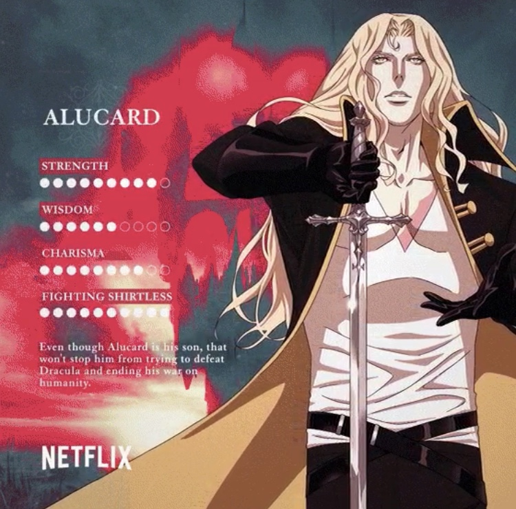 캐슬바니아(애니메이션)의 알루카드. 시즌 1의 최종보스.뱀파이어인 아버지 드라큘라 블라드 체페슈와 인간 어머니 리사의 사이에서 태어난 담피르다.