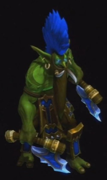 - 디자인을 보면 워크래프트 2 때의 양팔, 쌍도끼와 하의를, 와우에서 백발과 보라색 스카프[28]를 가져와 섞은 모습이다. 디자인 과정에서 탈락되었는지 바지와 벨트가 사라지고 워2 때의 모습에 가깝게 무릎 보호대를 착용했다. 그 외에도 엄니가 복면에 가려졌던 원작과 달리 엄니가 튀어나온 모습이다.