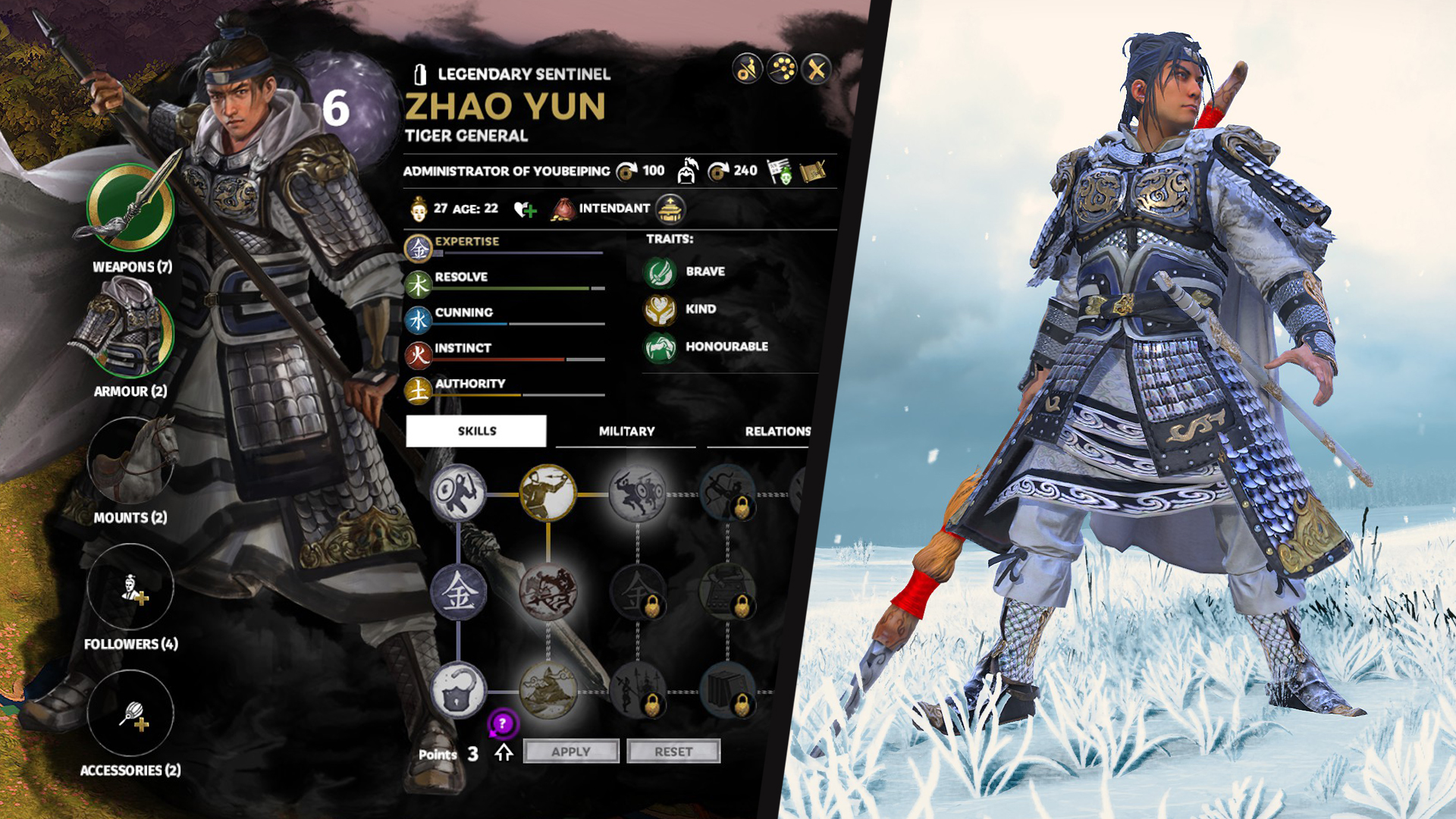 | 고유 배경 | 태원의 정찰병: 전문성 +10, 책략 +20, 본능 +30, 회복력 +1, 원거리 부대 유지비 -10%(세력 전체 / 상국, 지도자, 후계자일 때), 적 영토에서 군사 보급품 +5(세력 전체 / 상국, 지도자, 후계자일 때) (+완력) | |||||